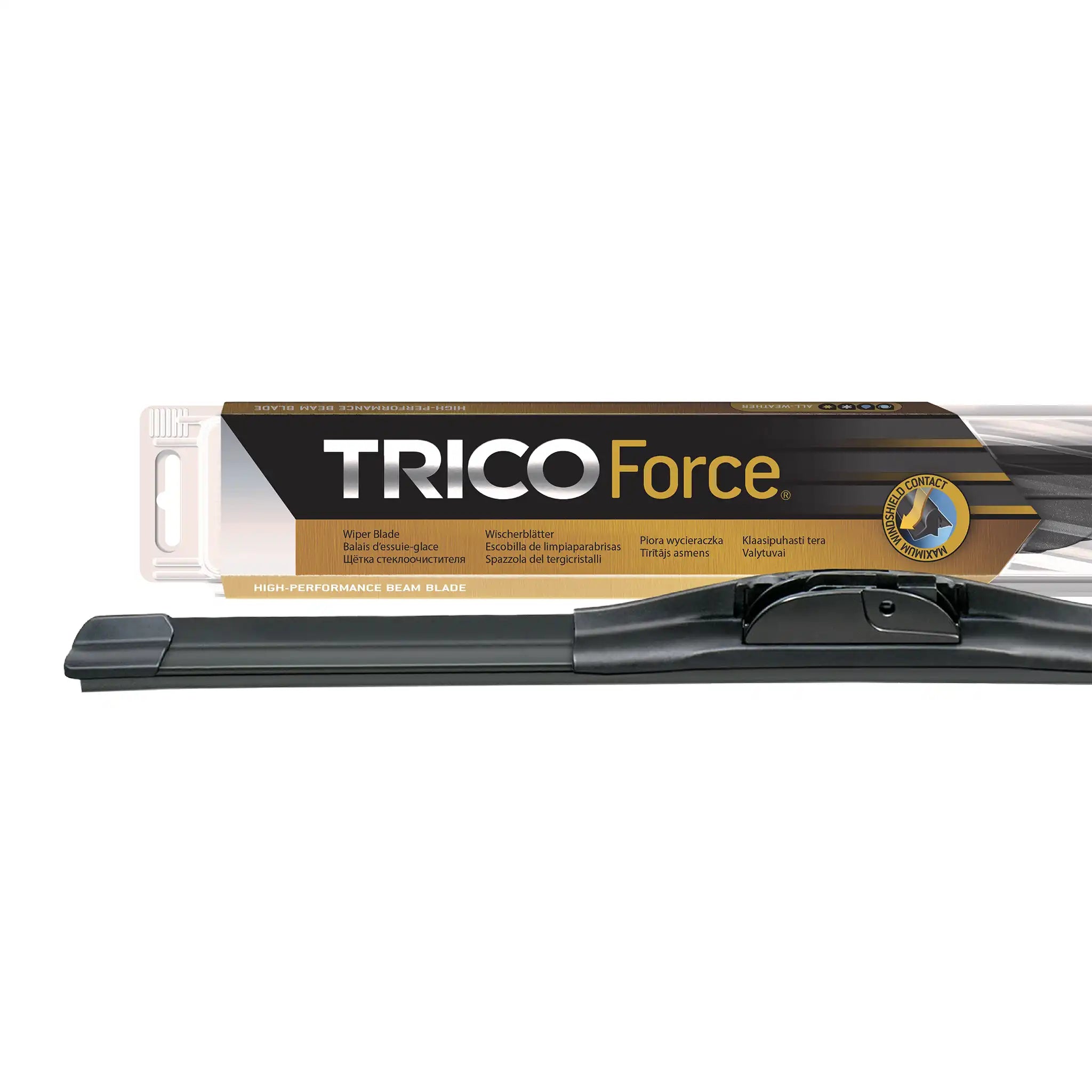 TRICO Force is a robustly engineered high wind beam blade with a patented swept-wing spoiler that slices through wind speeds in excess of 220 KPH caused by cross winds, buffeting truck winds and general traffic turbulence. The wiper blade developed for maximum performance.